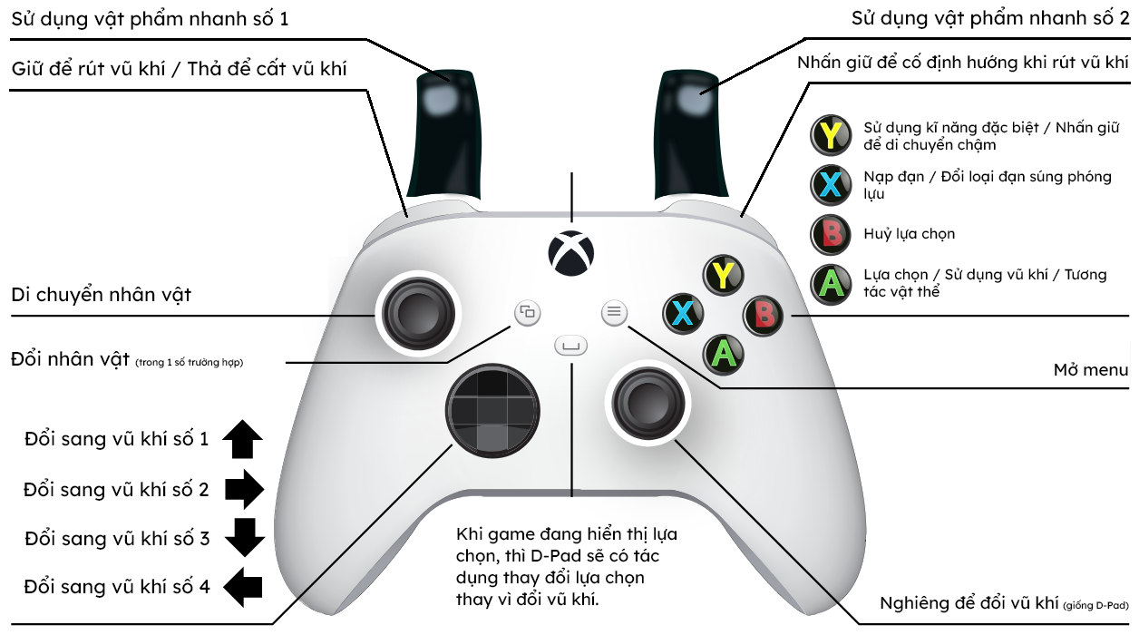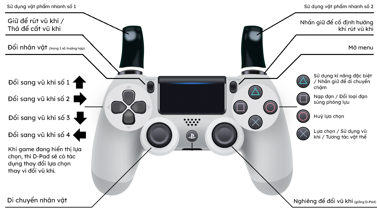 - Nút 1, 2, 3, 4: Đổi vũ khí đang trang bị.